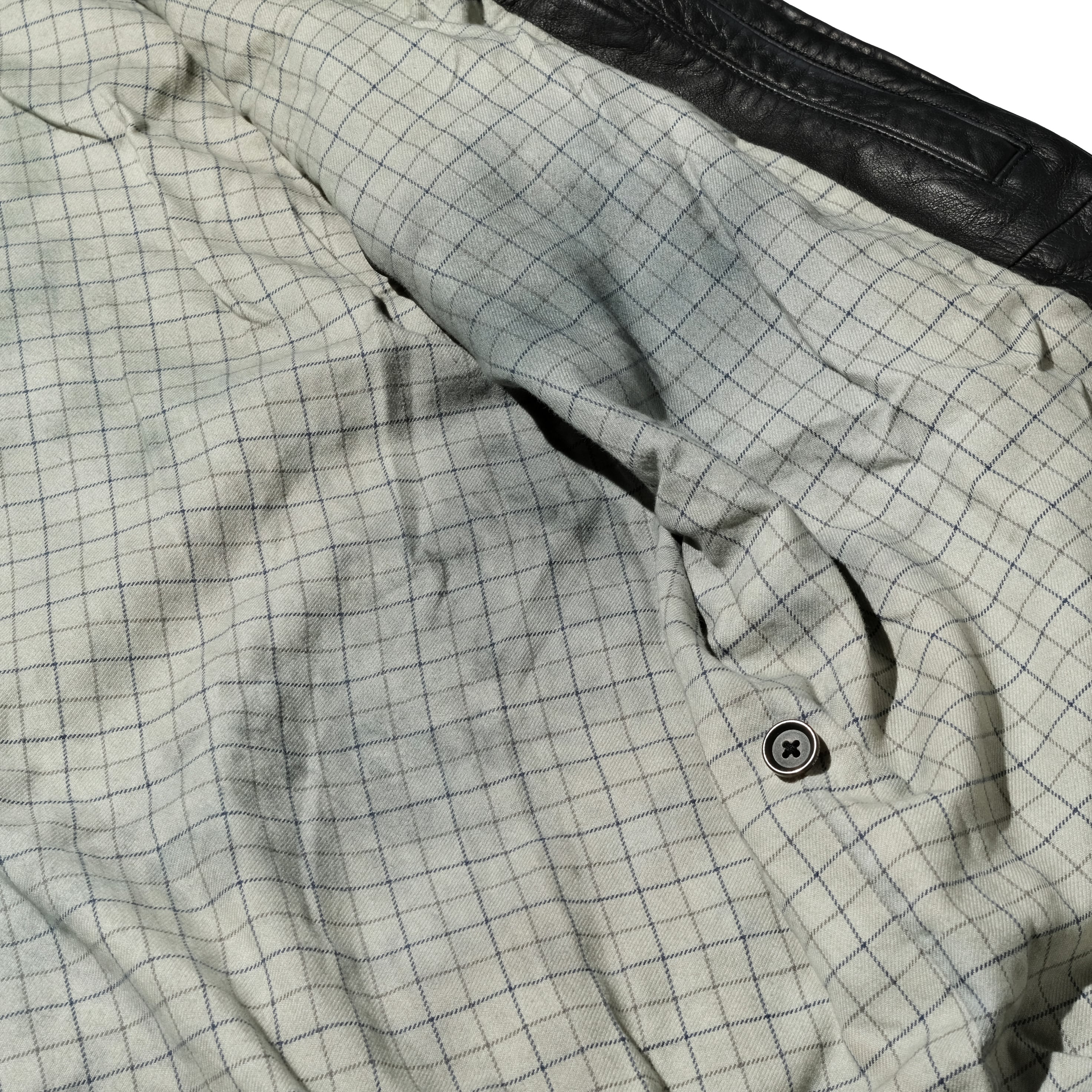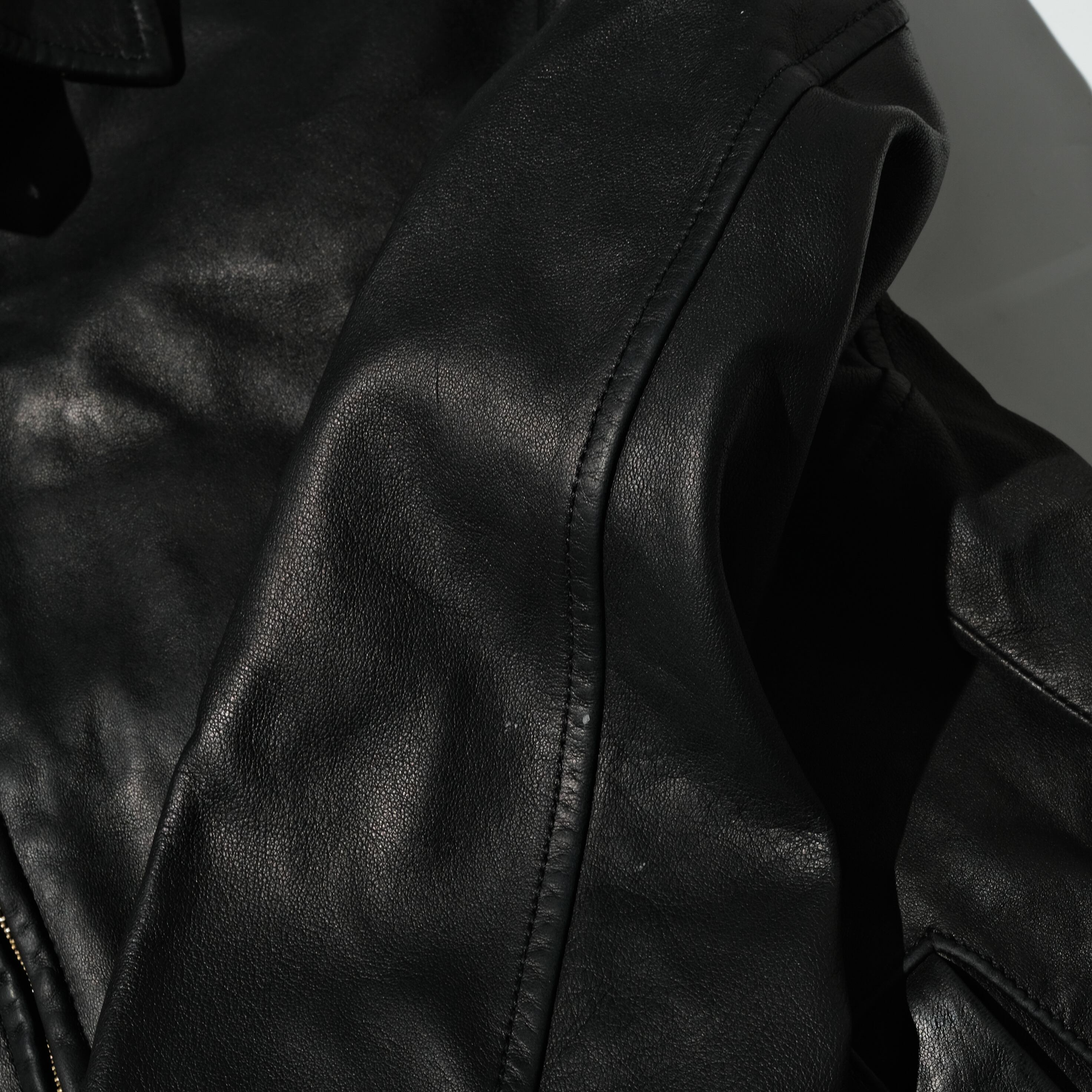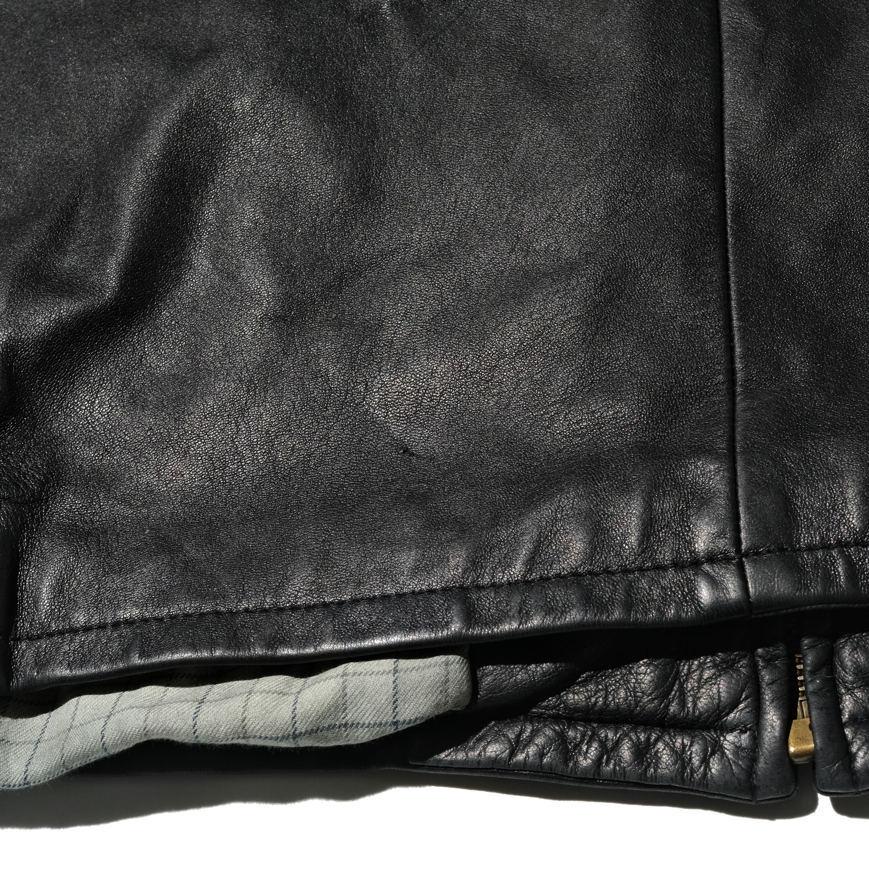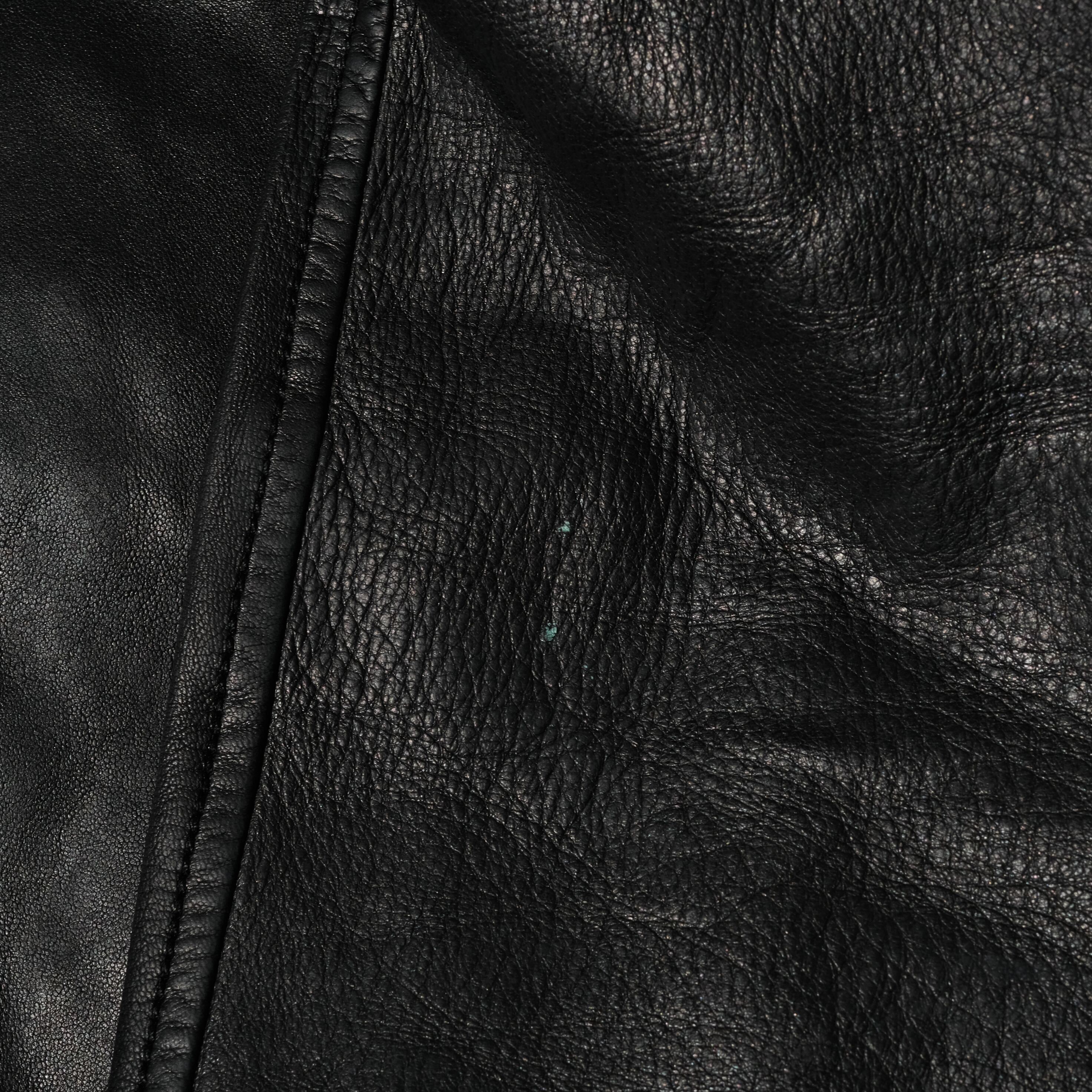 一番人気のブラックカラーの個体。サイズ表記はL、画像の171cmの着用者としては非常に良いサイズ感です。ライニングへの色移りが見られますが、白い布で擦ってみたところ付着は見られませんでしたのでそこまで気にする必要はないかとは思います。ただレザー全般に言えることですが湿気を気にする必要はありそうです。