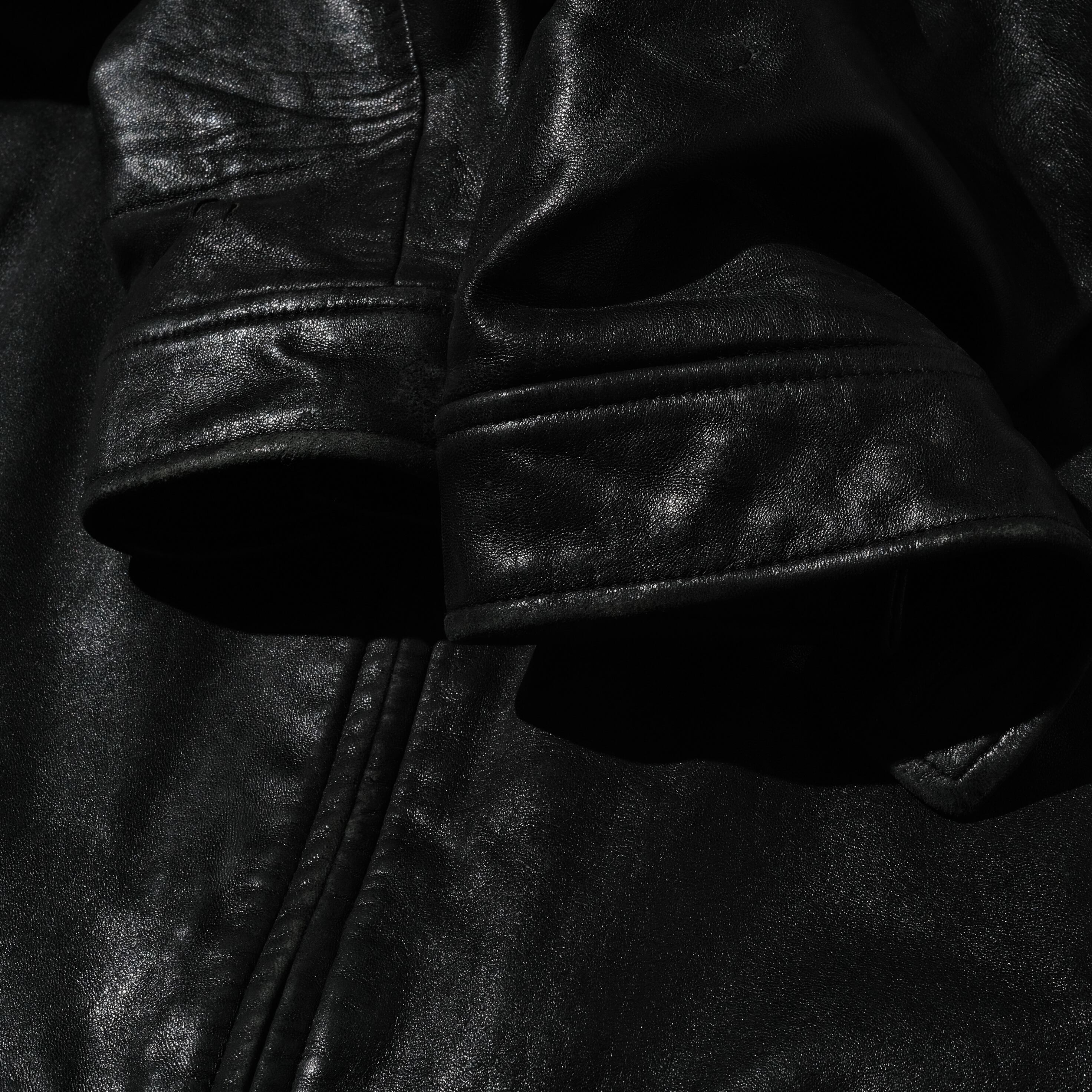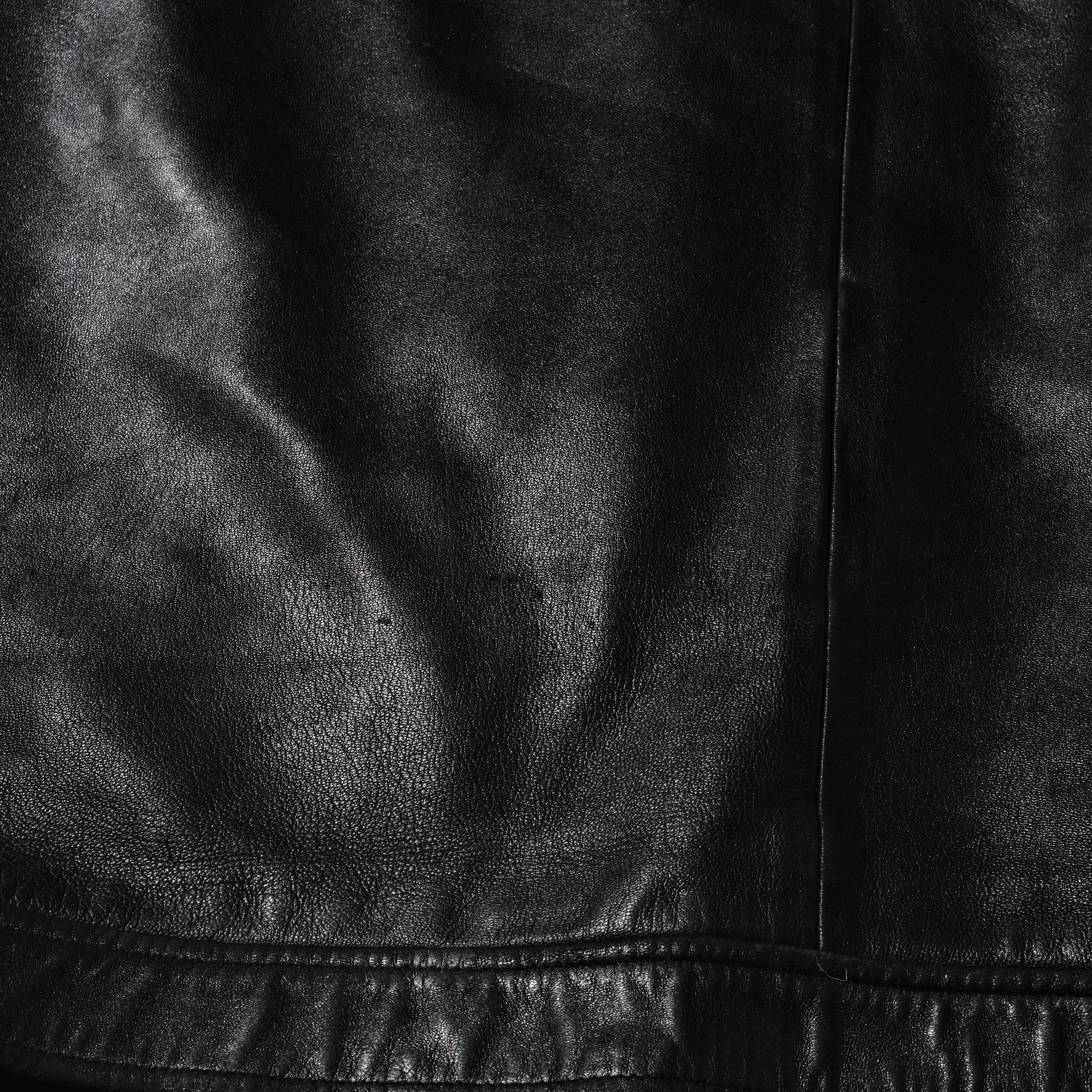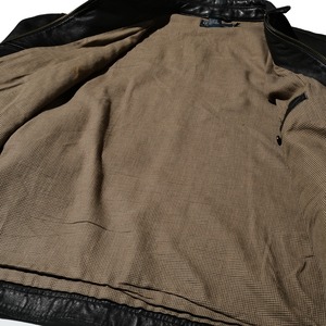 【状態】全体的に着用感、スレ。フロントジッパのスライダー交換(ジップを留める際にカチッと最後まで入れていただく必要がございます。)各ボタンほつれ。バックサイドボタンが一つ欠損しております。そのほかバックにスレ、キズ。左袖にキズ。ライニングにダメージ。そのほか所々レザー特有のスレやキズなどは見られますがレザー自体は艶やカラーは比較的残った状態かと思われます。