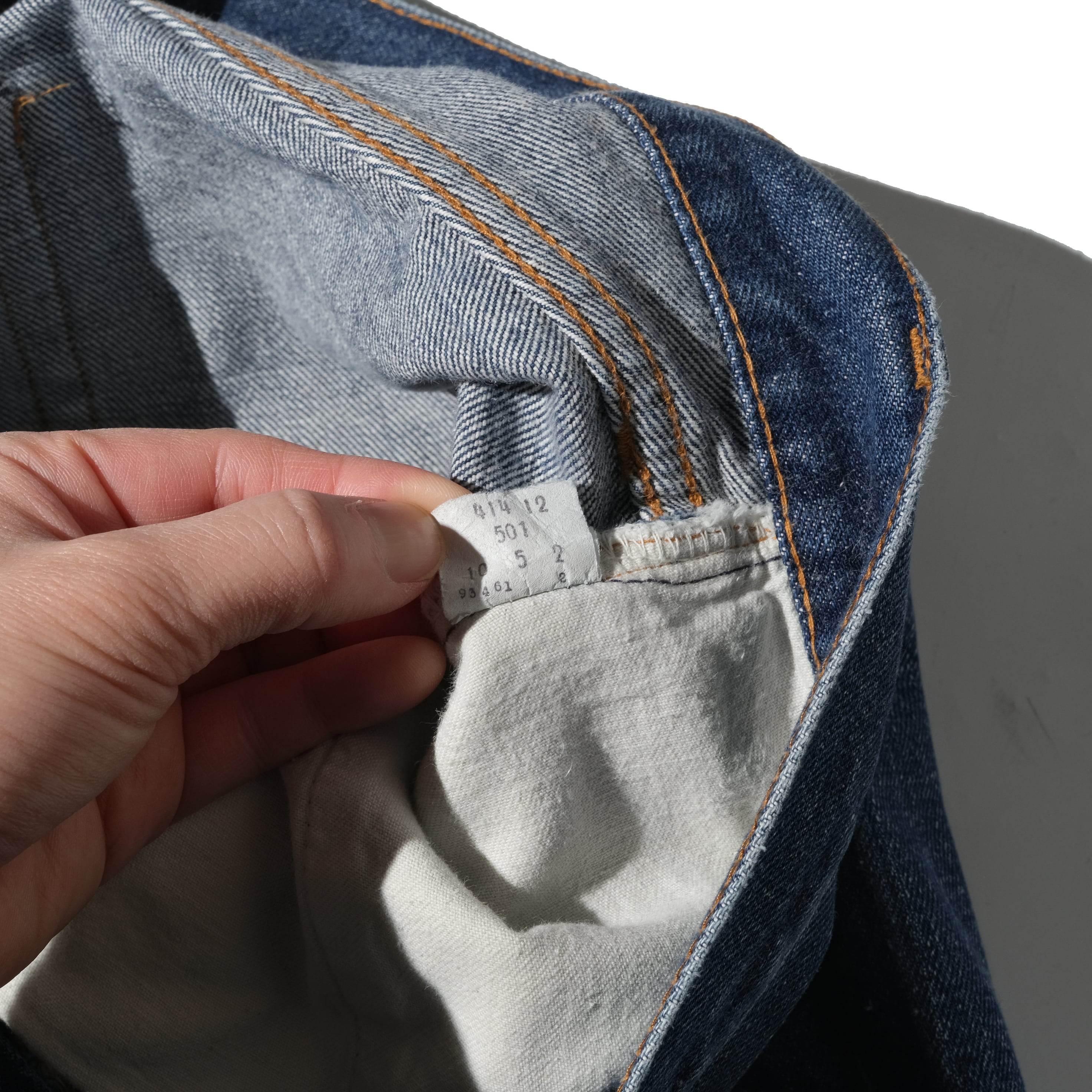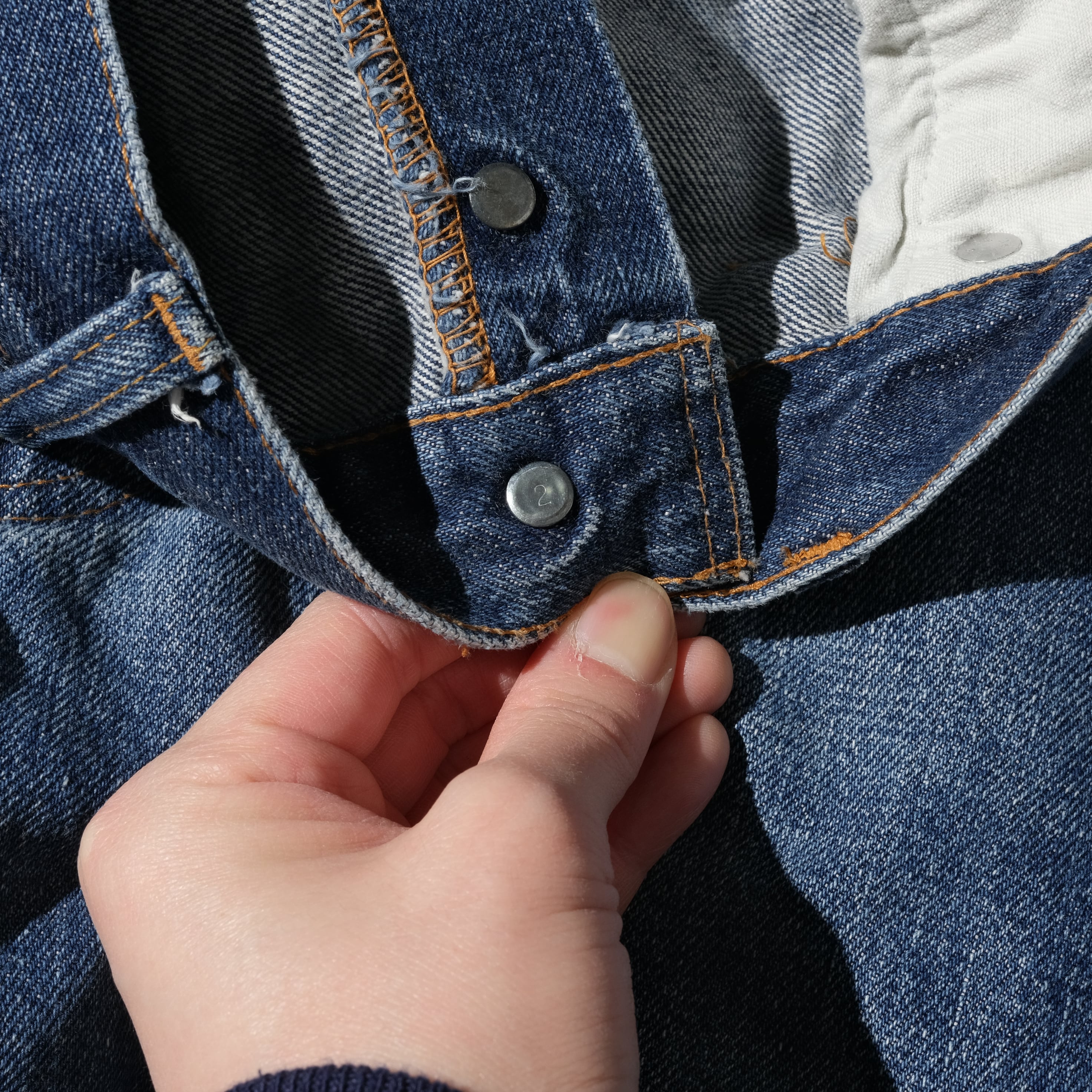 【状態】ボタン裏2。全体的に着用感、スレ。サイドにシルエットを詰めていた形跡が見られます。そのほかスレやヴィンテージデニム特有の小キズなどは見られますが、大きく目立つダメージやヨゴレなどのない良い状態です。