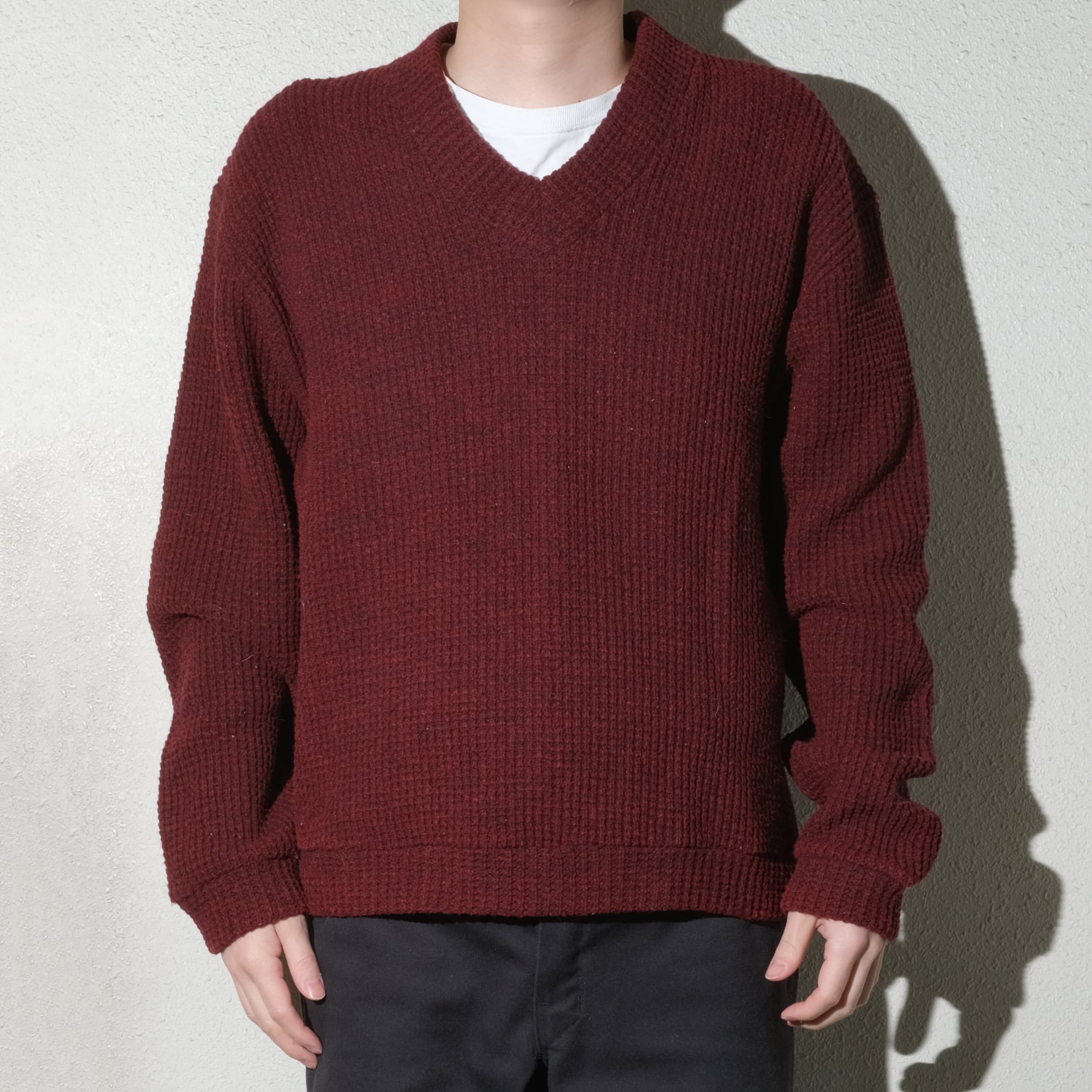 ミリタリーのオリーブカラーのアイテムと相性が良さそうなカラーの一着、Vネックですのでレイヤードも楽しんでいただけそうです。ぜひご検討ください。