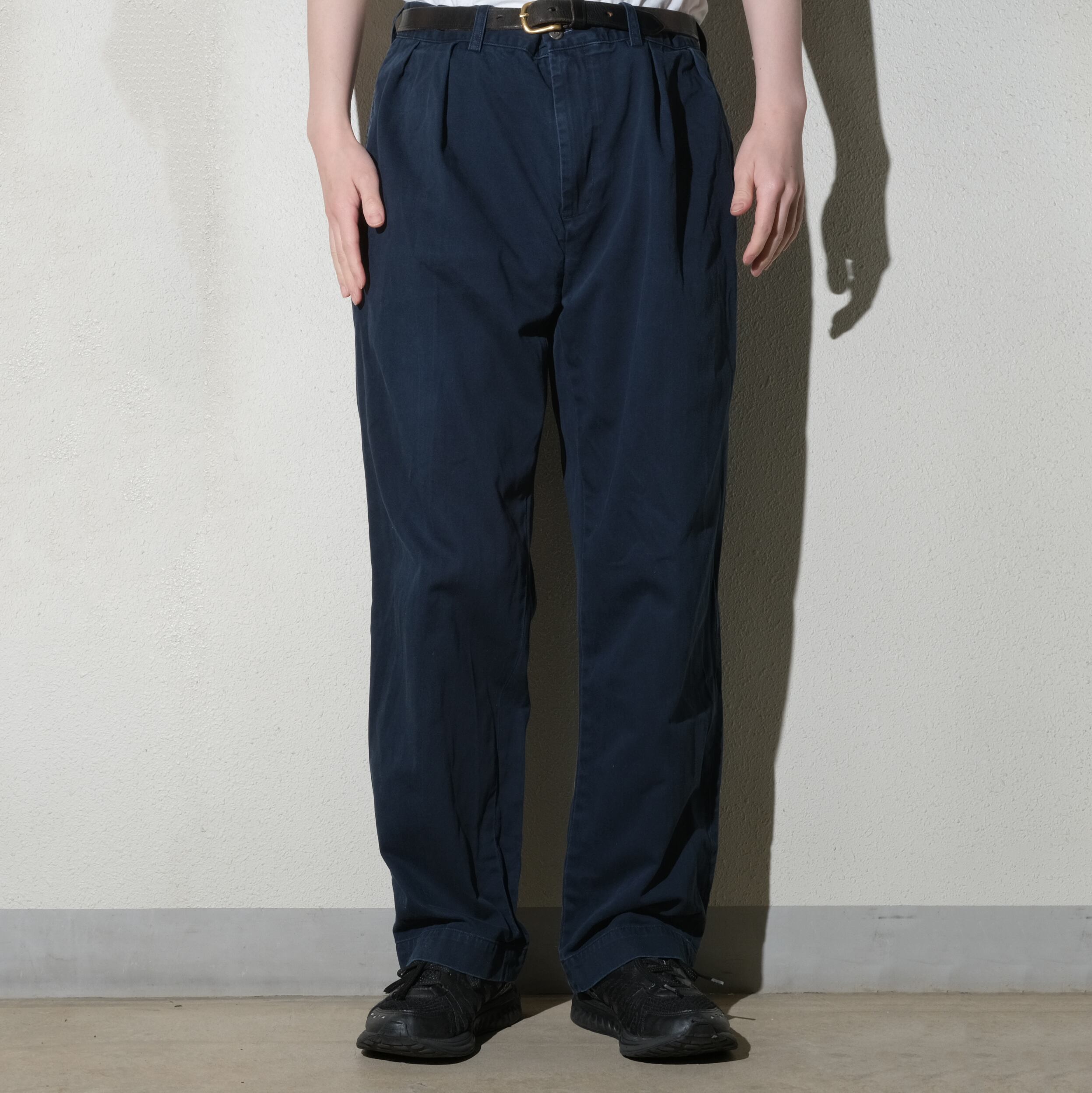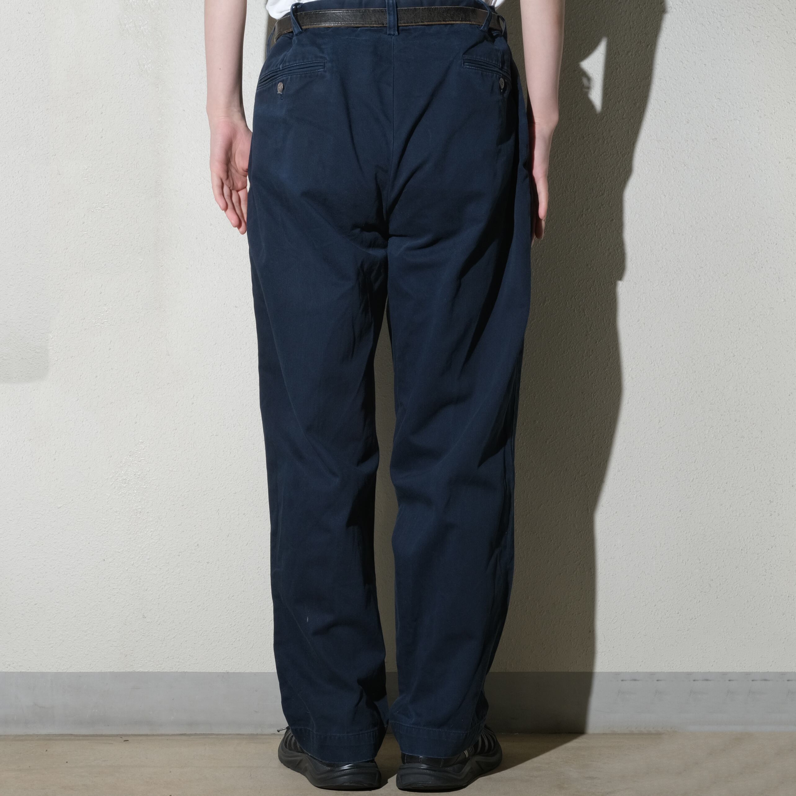 カラーもネイビーと人気のところ。定番のカーキに比べてかなり出づらいカラー、一本持っておくと使トップスを選ばず使いやすいかと思います。