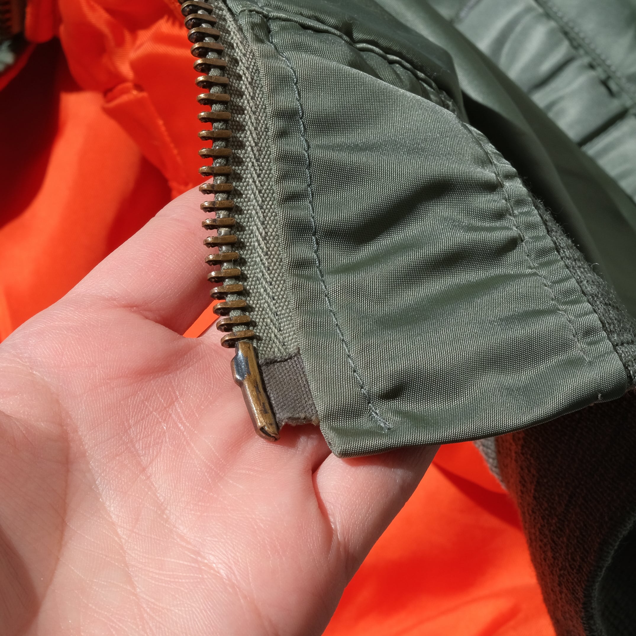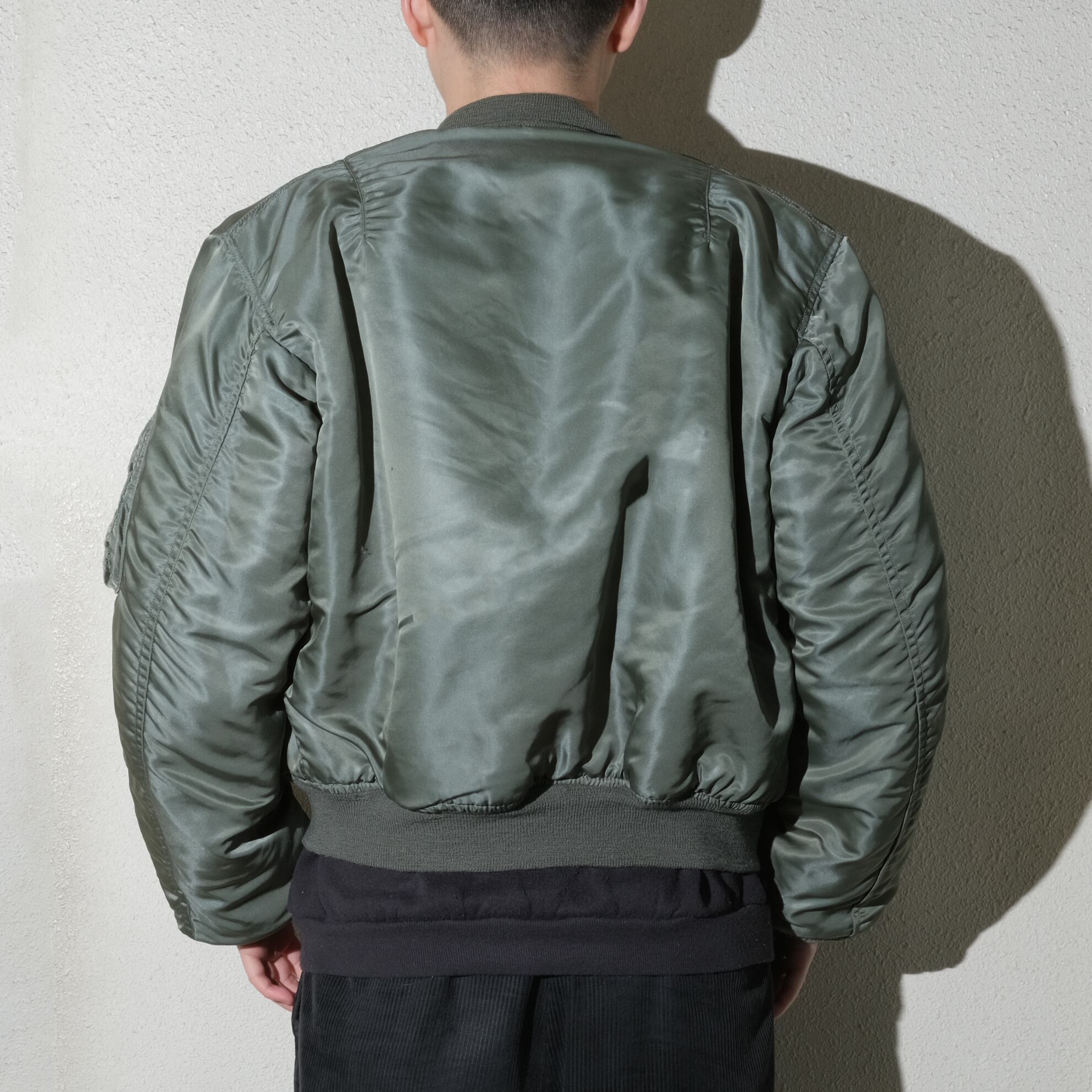 【状態】全体的に着用感、スレ。袖部、襟部リブにダメージ。バックに微かなヨゴレ。ジップ付近フェード。ヴィンテージのMA-1としてはいい状態の個体です。