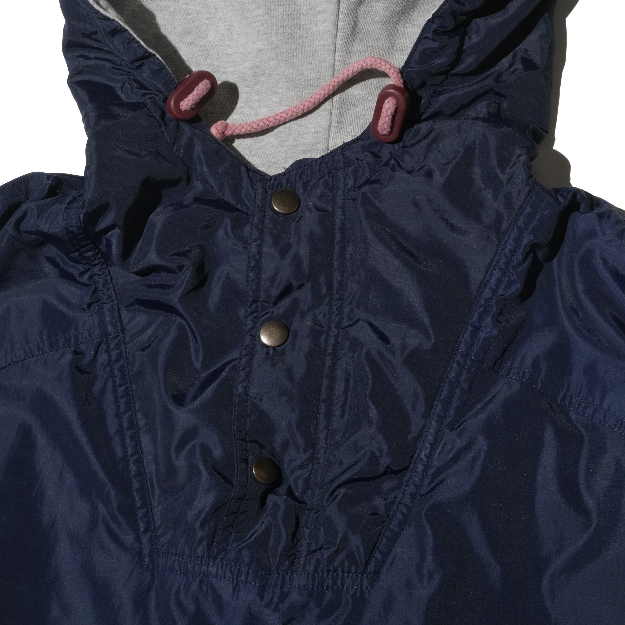 よく見かけるパッカブルタイプではなく、こちらはライニングや薄手のフィルなどの入ったタイプ。フード部分にジップが付いていたりと凝った作りです。